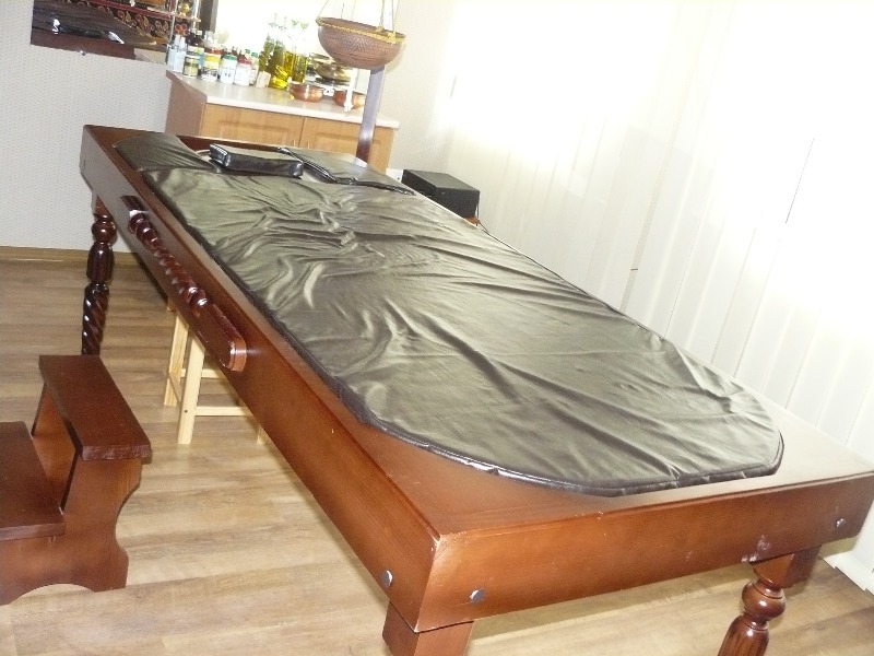 Большинство аюрведических процедур предполагает использование большого количества подогретого масла. Конструкция аюрведического массажного стола позволяет в течение всей процедуры сохранять масло в рамках стола и периодически собирать масло для дополнительного подогрева. Аюрведический массажный стол абсюлютно необходим для выполнения двух самых эффективных и востребованных процедур аюрведы – Абъянга (общий масляный массаж) и Широдара (проливание тонкой струи масла на середину лба).